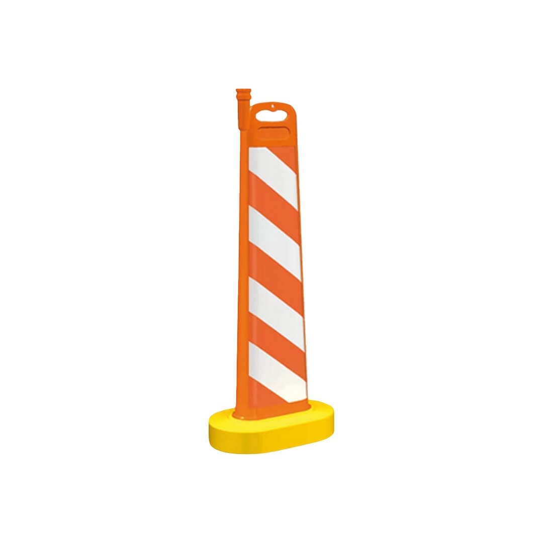 Descripción: Apilable. De alta visibilidad. Medidas cuerpo: Alto: 110.0 cm. Largo: 30.5 cm. Ancho: 16.0 cm. Cuerpo: Naranja. Base: Amarilla. Con textos se cotizará por separado. Tipo oval con una cara reflejante prismático.