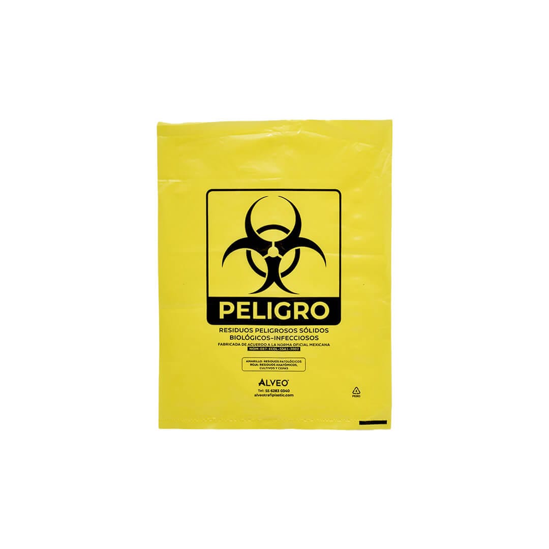 Descripción: Bolsa de polietileno de baja densidad, libre de metales pesados para la recolección de residuos biológico infecciosos. Carga Máxima: 1 kg. Impresa a una tinta con logotipo de biológico infeccioso. Sin fuelles. Calibre 200. Medidas: Ancho: 30.0 cm. Alto: 40.0 cm. Color: Amarillo.