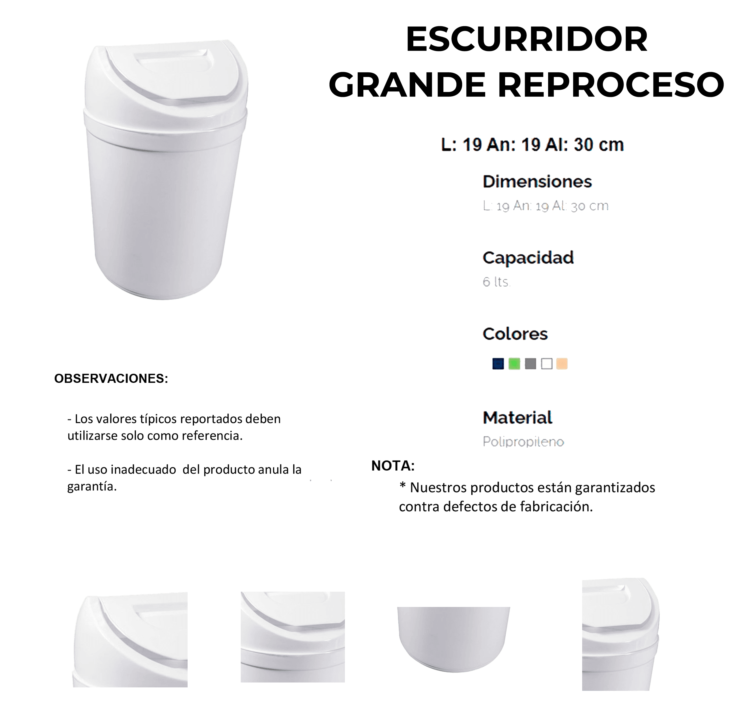 Descripción: Bote fabricado en polipropileno. Medidas: Largo: 19.0 cm. Ancho: 19.0 cm. Alto: 30.0 cm. Peso: 0.330 Kg. Capacidad: 6 lts. Color: Azul. Minimo de compra: 12 piezas.