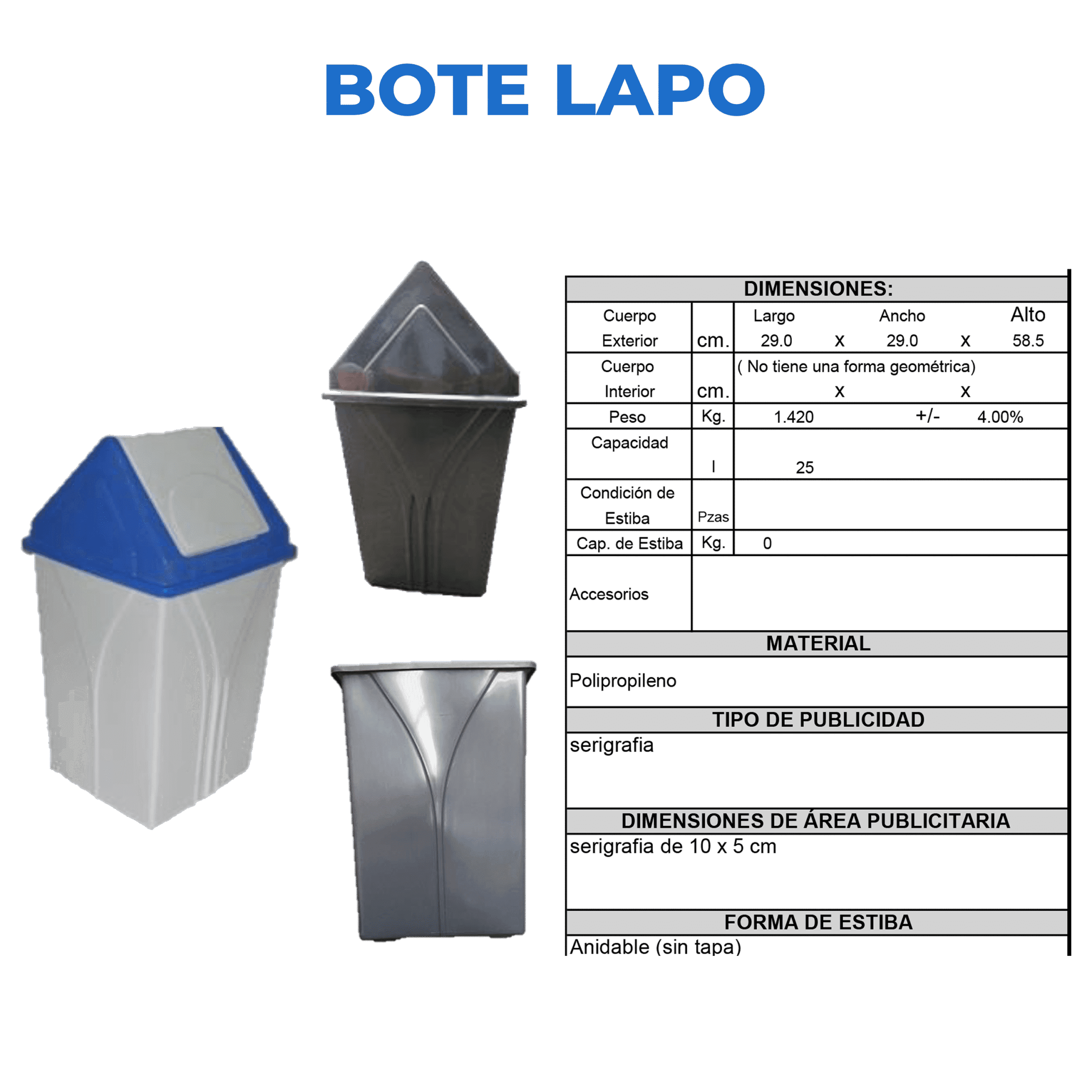 Descripción: Material: Polietileno. Medidas: Largo: 29 cm. Ancho: 23 cm. Alto: 58.5 cm. Peso: 1.142 Kg. Capacidad: 20 Lts. Color: Azul. Con tapa. Minimo de compra: 5 piezas.