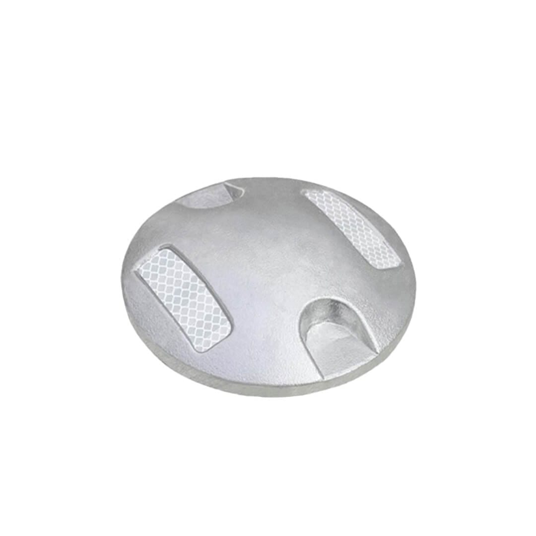 Descripción: Botón fabricado en alumino. Alta resistencia a impactos. Ideales como reductores de velocidad, para señalar zonas peatonales, cruces, vueltas, etc. Con dos caras de reflejantes. Con perno para sujeción. Medidas: diámetro: 10.0 cm, altura sin perno: 2.0 cm.