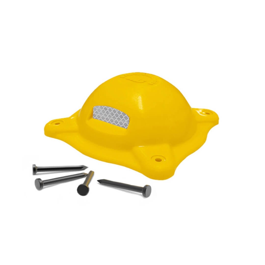 Descripción: Fabricada en polietileno de alta densidad. Acabado en color amarillo. Incluye 4 clavos de 1/4” x 2 1/2” de acero. Alta resistencia. Medidas: 16.5 cm. por lado. altura 5.5 cm. Reflejante alta intensidad ambas caras.