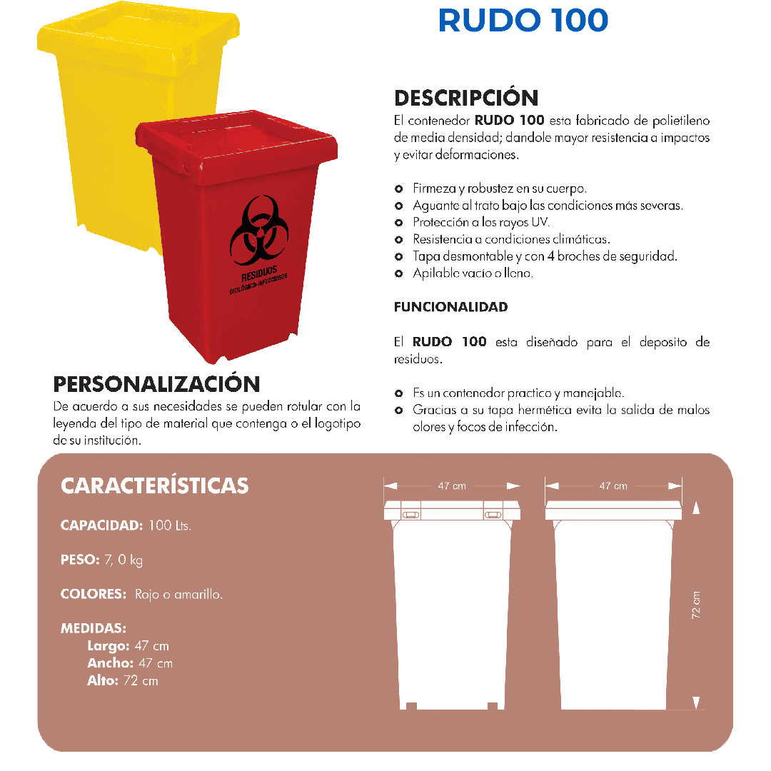 Descripción: Contenedor apilable fabricado en polietileno de media densidad, con tapa de cierre hermético, apilable tanto vacío como lleno. Capacidad: 100 Litros. Colores: Rojo. Largo: 43.5 cm. Ancho: 43.5 cm. Alto: 71.5 cm.