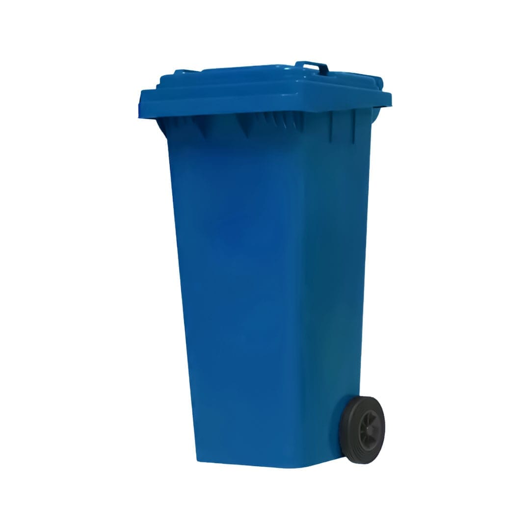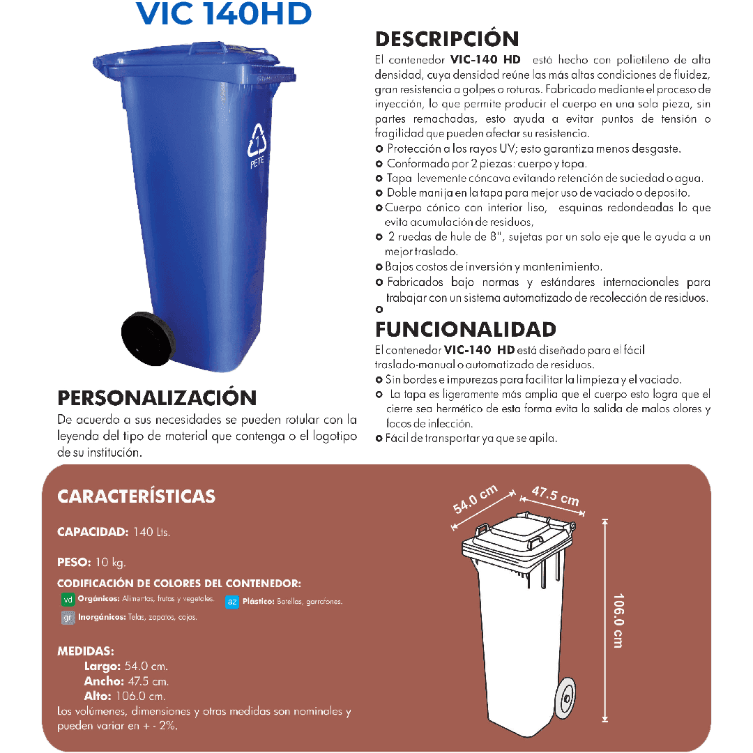 Descripción: Fabricado en polietileno de alta densidad. Contenedor con tapa y ruedas de hule. Capacidad: 140 litros. Color: Azul Pepsi. Ancho: 54.0 cm. Largo: 47.5 cm. Alto: 106.0 cm.