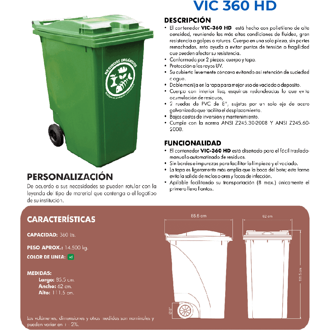 Fabricado en polietileno de alta densidad. Contenedor con tapa y 2 ruedas de PVC 8”. Gran resistencia a golpes y roturas. Protección a los rayos UV. Doble manija en la tapa para mejor uso de vaciado o deposito.