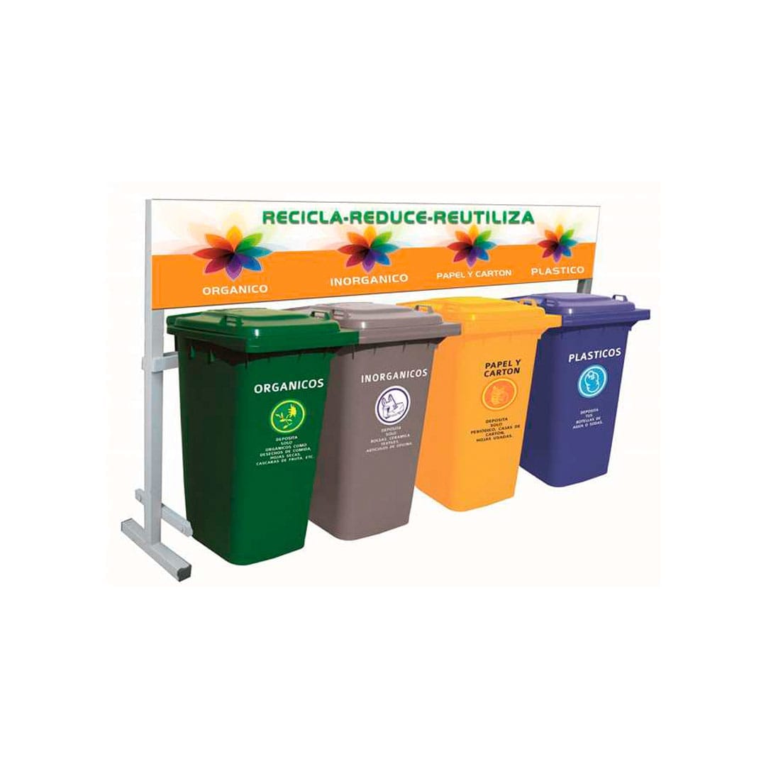 Descripción: Capacidad por contenedor: 240 lts. Colores del contenedor: Verde, gris, amarillo y azul. Medidas contenedor: Largo: 73.0 cm. Ancho: 58.0 cm. Alto: 108 cms. Color soporte: Gris Claro. Medidas estación: Largo: 220.0 cm. Ancho: 91.0 cm. Alto: 160.0 cm. Capacidad total de reciclaje: 360 lts. Espacio publicitario con una cara al frente. Espacio publicitario: largo 200.0 cm. Alto 40.0 cm.