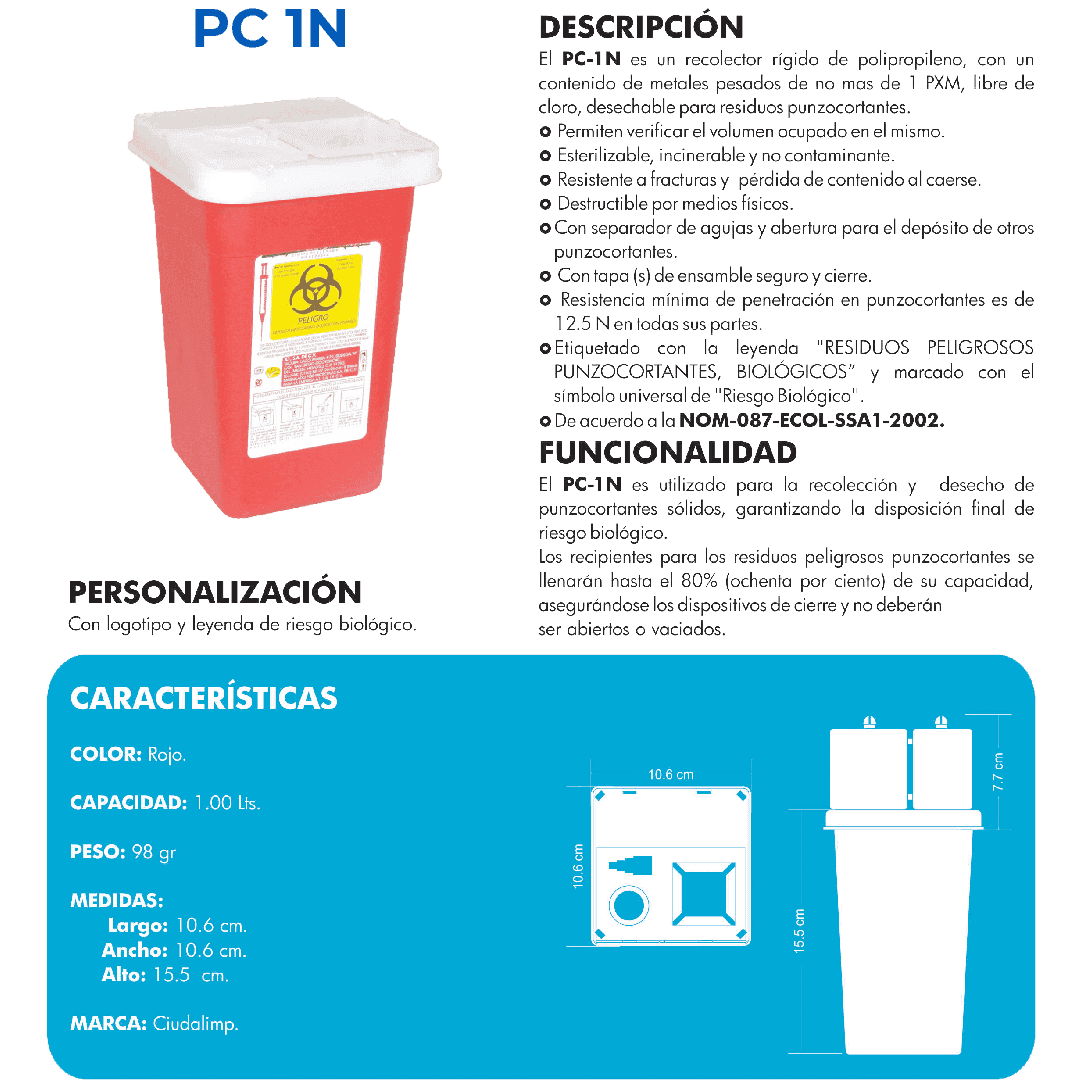 Descripción: Recolector de polipropileno para punzocortantes. Capacidad Volumen: 1.0 Litros. Medidas: Largo: 10.1 cm. Ancho: 10.1 cm. Alto: 21.0 cm.