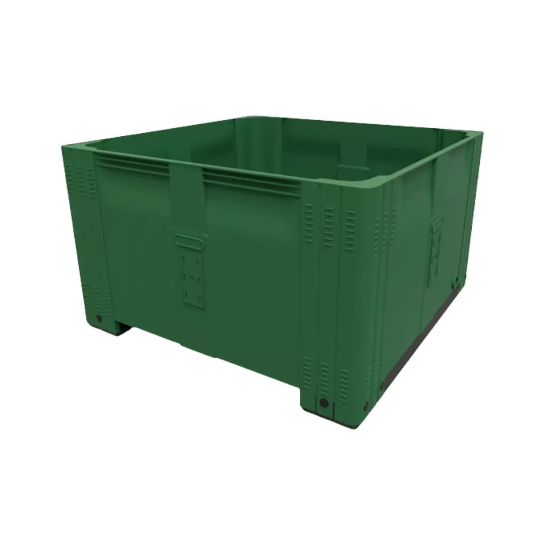 Descripción: Contenedor fabricado en polietileno de alta densidad. Grado alimenticio aprobado por la FDA. Doble pared en el centro y esquinas posteriores que refuerzan el contenedor. Soporte de carga comprobada hasta 500 Kg. Apilable hasta 4000 Kg en almacenamiento en frío. Apilable hasta 3000 Kg. en temperatura de 35° C más de un mes, y hasta 2000 Kg. más de un año. Sin ranuras de ventilación. Capacidad: 780 Lts. Peso: 45 Kg. Profundidad: 645 mm Largo 1165 Ancho 1165 mm Alto: 780 mm Estiba Aprox: 3 Cont. Color: Verde. Excelentes para separar grandes cantidades de ropa en lavanderías, hoteles y hospitales.