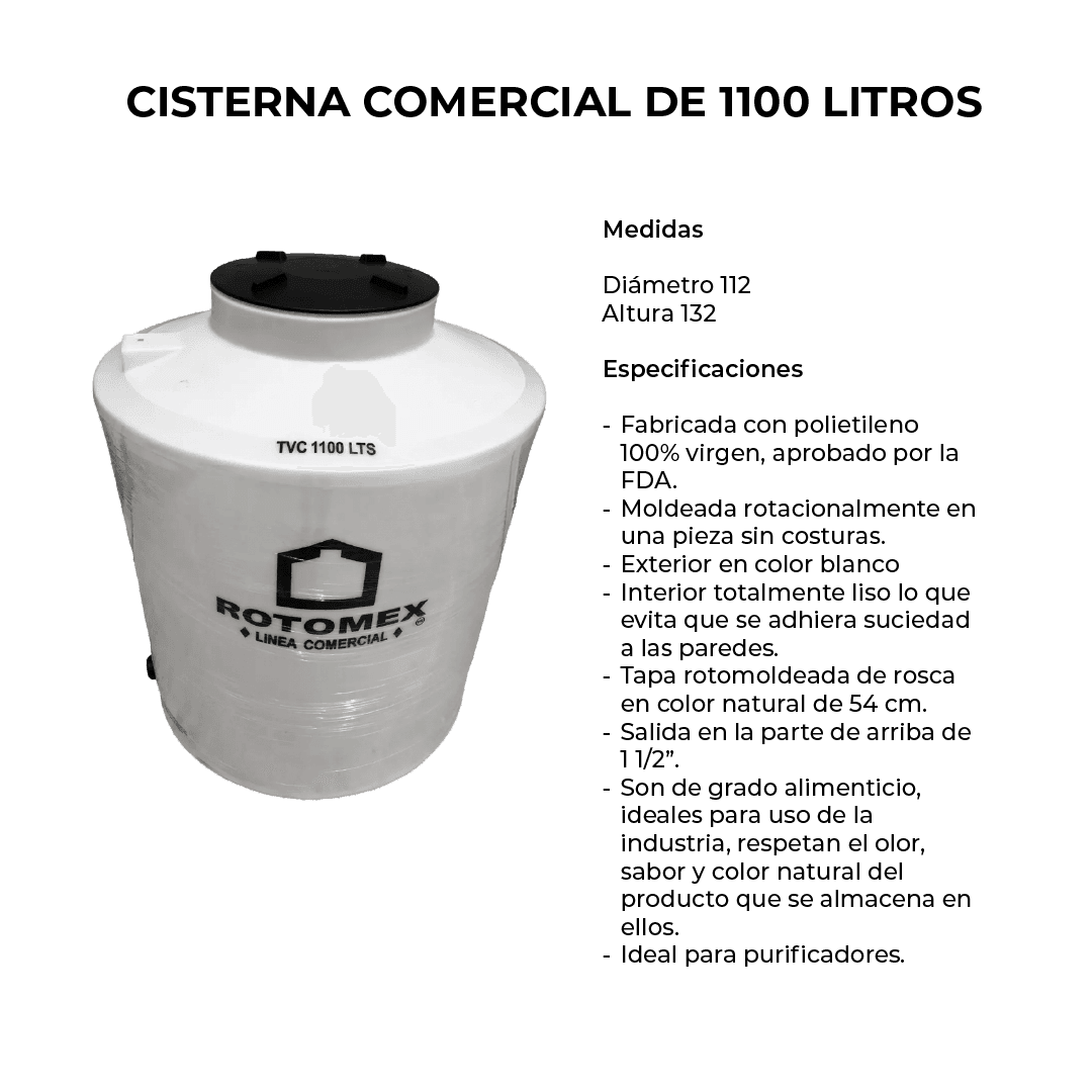 Descripción: Fabricado con polietileno 100% virgen, aprobado por la FDA. Moldeada rotacionalmente en un pieza sin costuras. Exterior en color blanco Interior totalmente liso lo que evita que se adhiera suciedad a las paredes Tapa rotomoldeada de rosca en color natural de 54 cm Salida en la parte de abajo de 1 1/2" Son de grado alimenticio, ideales para uso en la industria, respetan el olor, sabor y color natural del producto que se almacene en ellos. ideal para purificadoras. Alto: 132 cm. Diámetro: 112 cm. Capacidad: 1,100 Litros. Incluye kit básico.