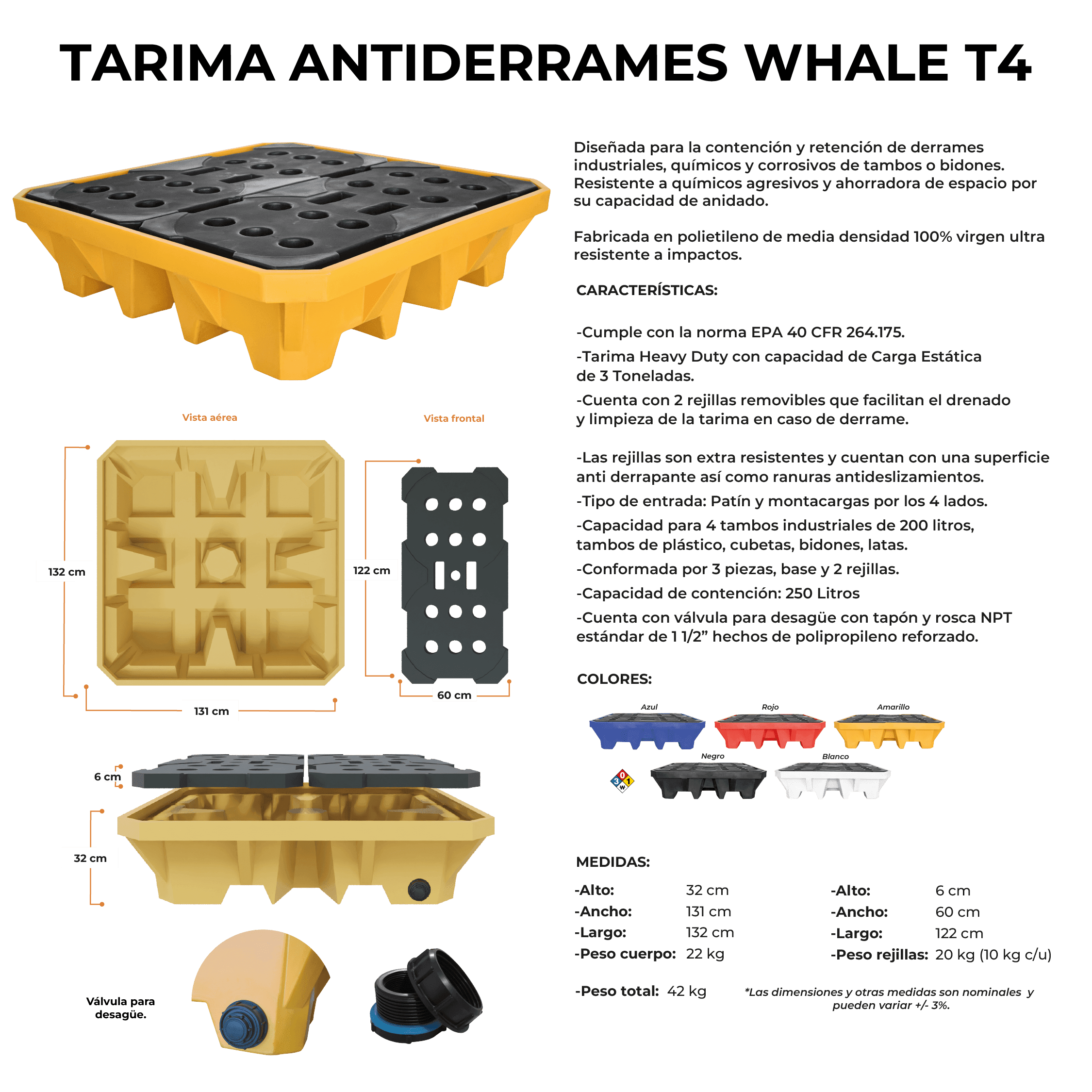 Descripción: La tarima antiderrames Whale T4 está diseñada para la contención de derrames industriales, químicos y corrosivos de tambos o bidones. Cumple con la norma EPA 40 CFR 264.175 para contención secundaria. Fabricada en polietileno de media densidad 100% virgen. Habilitada para patín y montacargas por los 4 lados. Las rejillas cuentan con ranuras antideslizamientos. Capacidad de contención: 250 Litros. Color: Amarillo. Medidas: Alto: 32.0 cm. Ancho: 131.0 cm. Largo: 132.0 cm. Peso cuerpo: 22.0 Kg. Peso rejillas: 10.0 kg cada una. Peso total: 42.0 Kg.