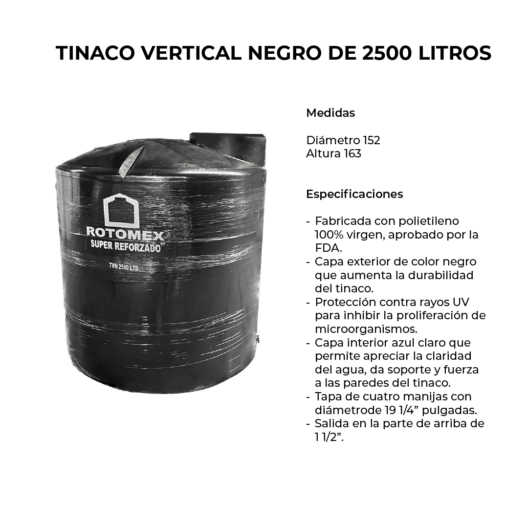 Descripción: Capa exterior de color negro que aumenta la durabilidad del tinaco. Protección contra rayos UV para inhibir la proliferación de microorganismos. Capa interior azul claro que permite apreciar la claridad del agua, da soporte y fuerza a las paredes del tinaco. Tapa de cuatro manijas con diámetro de 19 1/4" pulgadas. Salida en la parte de abajo de 1 1/2" Alto: 163 cm. Diámetro: 152 cm Capacidad: 2,500 Litros. Incluye kit básico.